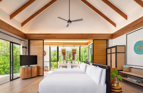 Hilton Maldives Amingiri Resort & Spa offers 108 air-conditioned accommodations, which are accessible via exterior corridors and feature private pools and minibars. These individually decorated and furnished accommodations include dining tables. A pillow menu is available. 55-inch flat-screen televisions come with cable channels. Bathrooms include separate bathtubs and showers with deep soaking bathtubs and rainfall showerheads. Bathrooms are also outfitted with bathrobes, slippers, and bidets.
